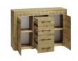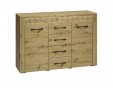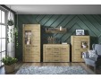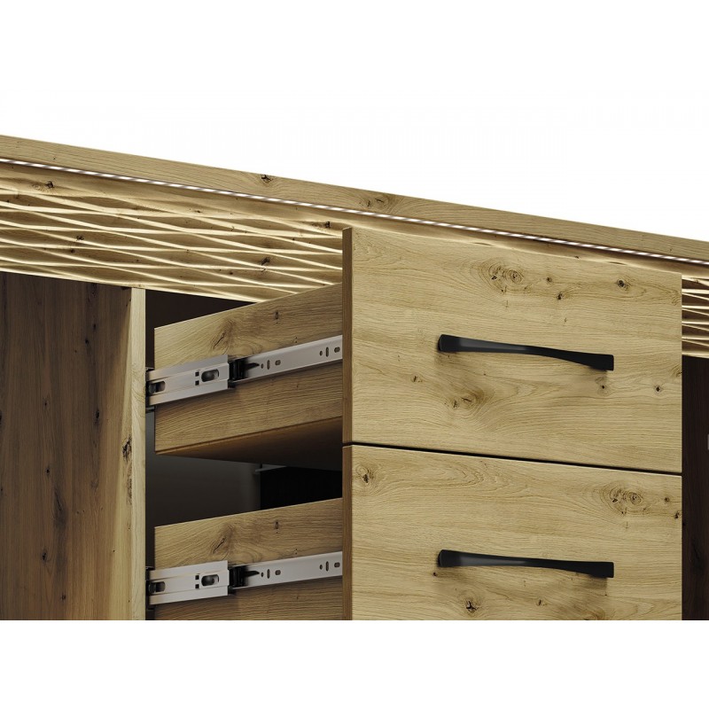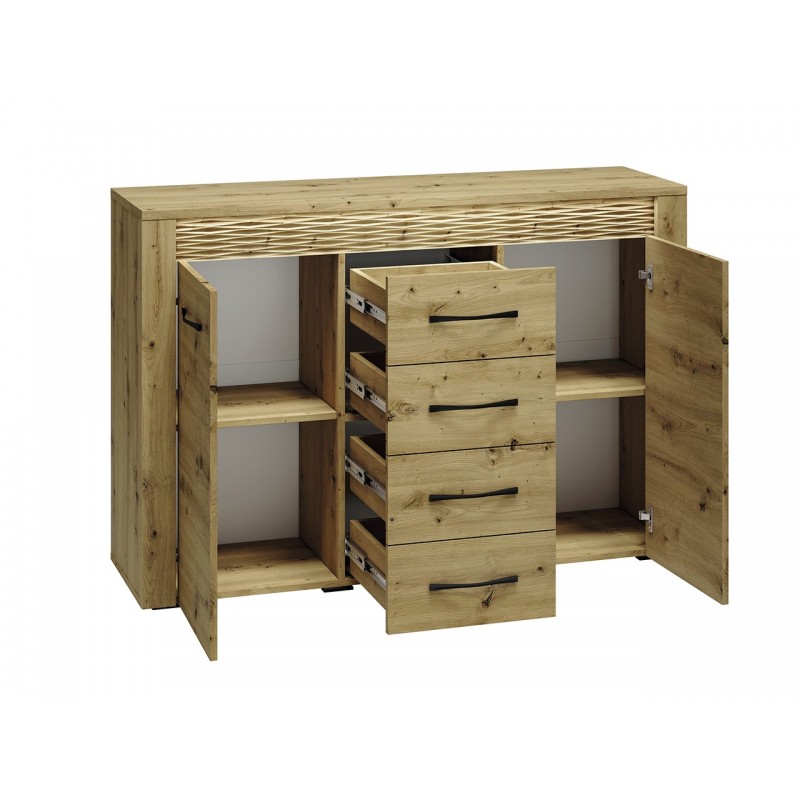 Komoda Artis 07 jest ponadczasowa i uniwersalna, dzięki czemu pasuje do wielu wnętrz oraz pomieszczeń. Mebel został wyposażony w cztery szuflady o wzmocnionym dnie, które pomieszczą i udźwigną ciężar naszych dokumentów czy bibelotów. Co więcej, szuflady zamontowane na prowadnicach kulkowych umożliwiają całkowite i ciche ich wysunięcie. Po zewnętrznych stronach komody umieszczono pojemne szafki z półkami. Mebel został wykonany z wysokiej jakości płyty laminowanej, zabezpieczonej obrzeżem ABS, co wpływa na trwałość i estetykę bryły. Ciepła tonacja dębu artisan z czarnymi dodatkami wpisuje się w aktualne trendy. Co więcej, designerska, podświetlana listwa MDF dodaje wnętrzu przytulności i ciepła. Komoda będzie pięknie zdobić pomieszczenie stojąc osobno, jak i w towarzystwie witryny lub szafy z tej samej kolekcji.
