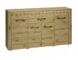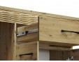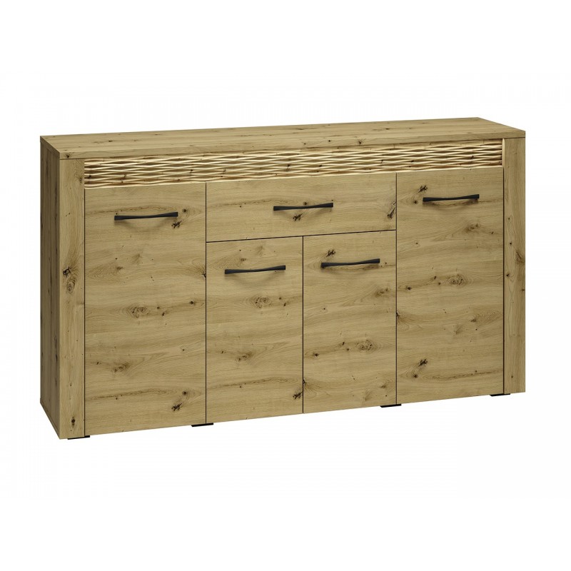 Komoda Artis 08 jest ponadczasowa i doskonale pasuje do wielu wnętrz oraz pomieszczeń. Solidna konstrukcja oraz duży wymiar sprawiają, że mebel jest bardzo funkcjonalny i idealny do przechowywania. Mebel został wyposażony w szufladę o wzmocnionym dnie, zamontowaną na prowadnicach kulkowych, umożliwiających całkowite i ciche jej wysunięcie. Poniżej oraz po zewnętrznych stronach komody umieszczono praktyczne szafki. Zawiasy z cichym domykiem bezgłośnie dociągają fronty, a zabezpieczone obrzeżem ABS krawędzie prezentują się bardzo estetycznie. Wyraźne usłojenie, ciepłe wybarwienie oraz podświetlona ryfla wprowadzają do wnętrza wyjątkowy nastrój. Komoda będzie pięknie zdobić pomieszczenie stojąc osobno, jak i w towarzystwie witryn lub szafy z tej samej kolekcji.
