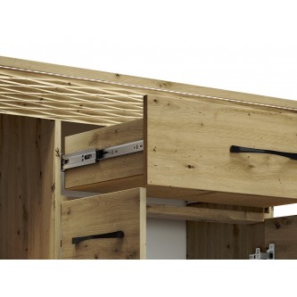 Ciepła, dębowa kolorystyka, podświetlana wstawka oraz metalowy uchwyt sprawiają, że kolekcja Artis nadaje wnętrzom niepowtarzalnego charakteru.