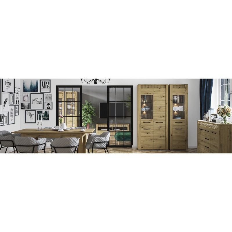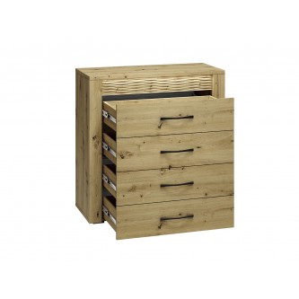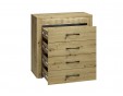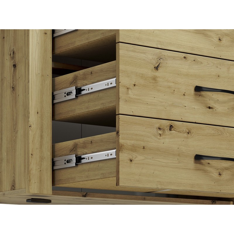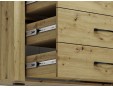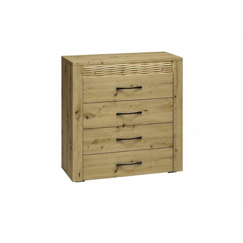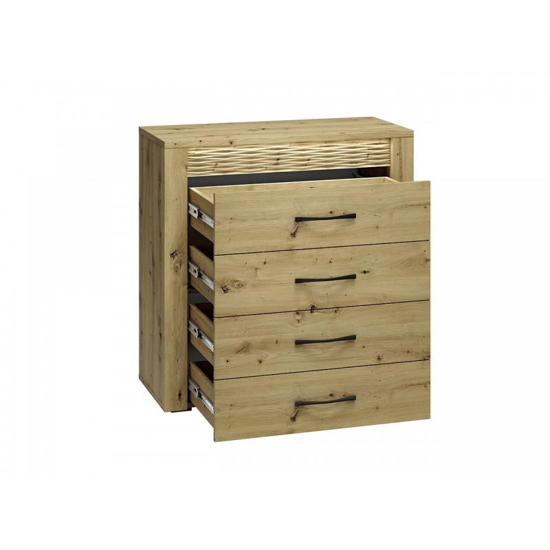 Komoda Artis 09 to mebel uniwersalny, funkcjonalny i pasujący do wielu wnętrz oraz pomieszczeń. Mebel został wyposażony w cztery szuflady o wzmocnionym dnie, dzięki czemu pomieszczą i udźwigną ciężar naszych dokumentów czy bibelotów. Szuflady zamontowano na prowadnicach kulkowych, umożliwiających ciche i pełne wysunięcie, tak by użytkowanie komody było przyjemnością. Mebel został wykonany z wysokiej jakości płyty laminowanej, zabezpieczonej obrzeżem ABS, co wpływa na trwałość i estetykę bryły. Całości dopełnia podświetlona ryflowana wstawka oraz metalowe uchwyty o wyprofilowanym kształcie.