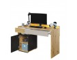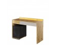 Biurko wyróżnia się ciekawym designem – geometryczny kształt, fronty wsunięte pod korpus oraz trzy kolory – szarość, dekory o barwie drewna i surowej stali tworzą niepowtarzalny kubistyczny patchwork. Nowoczesny charakter bryły podkreślają dodatkowo kształtne, metalowe uchwyty i niewysokie podpory. W komplecie jest oświetlenie ledowe bryły.