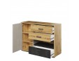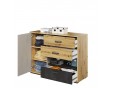 Komoda wyróżnia się ciekawym designem – geometryczny kształt, fronty wsunięte pod korpusy oraz trzy kolory – szarość, dekory o barwie drewna i surowej stali tworzą niepowtarzalny kubistyczny patchwork. Nowoczesny charakter bryły podkreślają dodatkowo kształtne, metalowe uchwyty oraz niewysokie podpory.