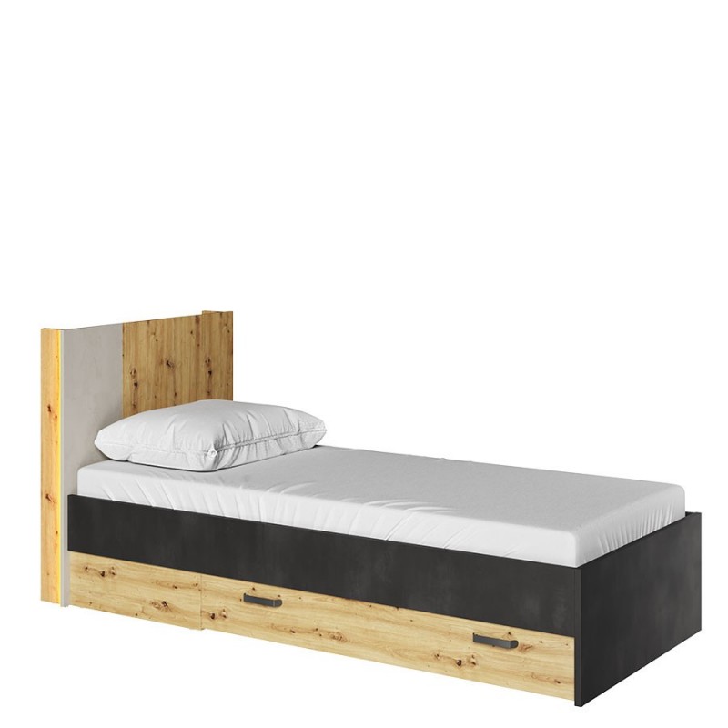 Skrzynię łóżka zaprojektowano w kolorze surowej stali, zagłówek został podzielony między ciepłą barwę drewnopodobnego dekoru oraz jasną szarość. Takie połącznie sprawia, że mebel jest bardzo nowoczesny, ale też uniwersalny – nadaje się zarówno do pokoi dziewcząt, jak i chłopców.