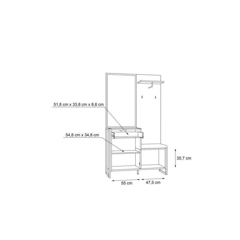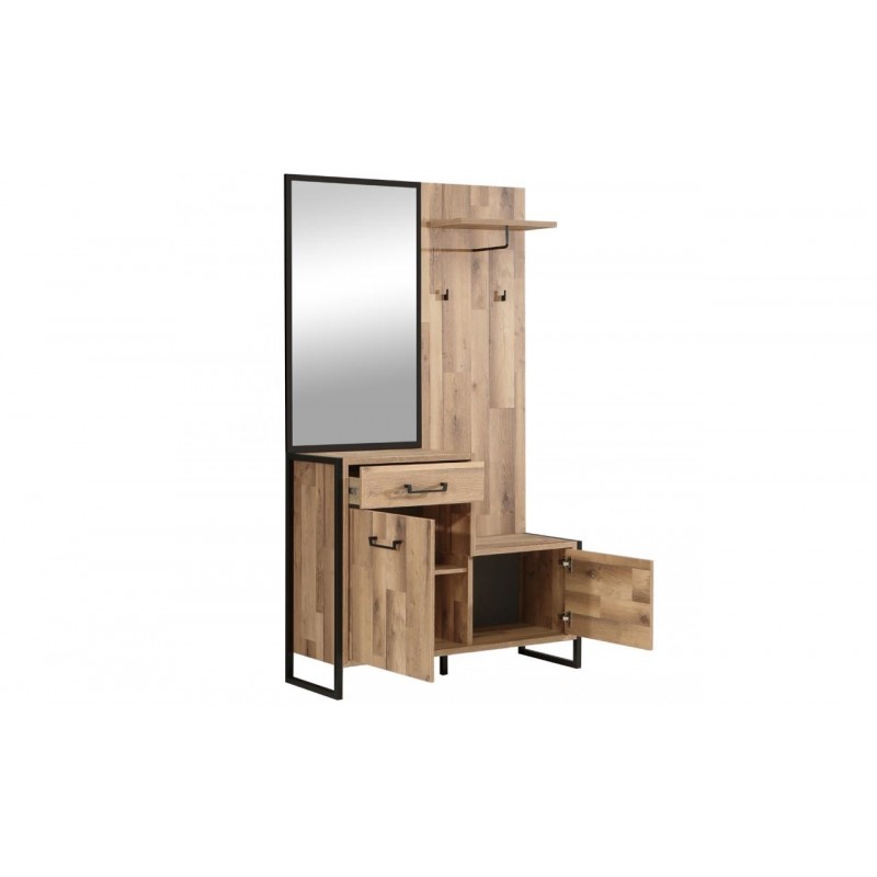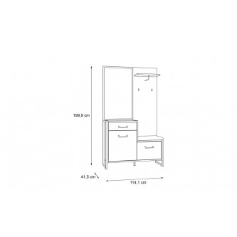- Na zestaw składają się dwie szafki, szuflada, lustro w czarnej ramie, półka oraz haczyki