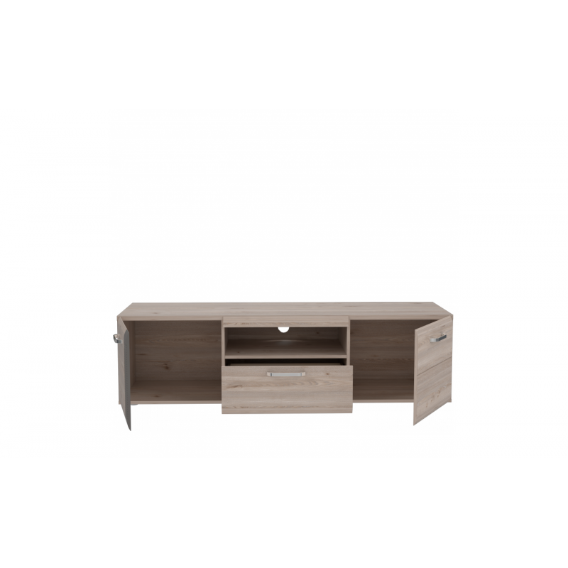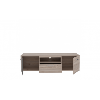 - Szafka posiada dwie zamykane półki, pojemną szufladę i otwartą wnęka na sprzęt RTV