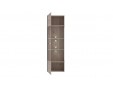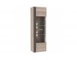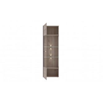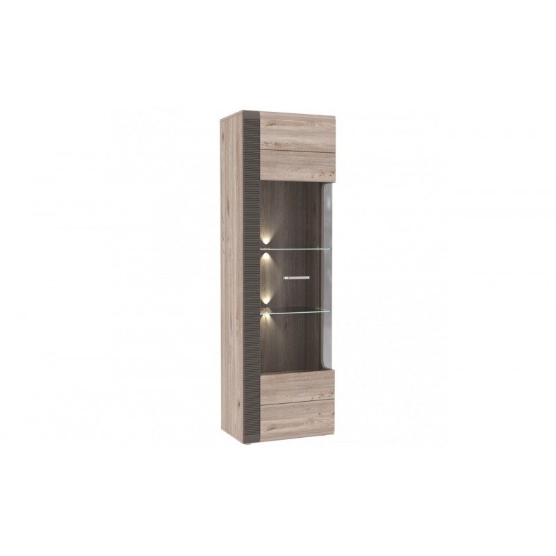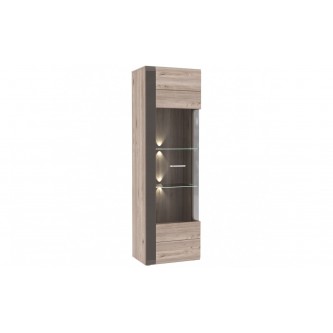 Wysoka witryna w jasnym dębowym wybarwieniu przełamanym ryflowanymi wstawkami w głębokim odcieniu szarości przeznaczona jest do salonu oraz jadalni. Subtelnie zaokrąglona krawędź frontu dodaje bryle uroku a błyszczący metalowy uchwyt podkreśla nowoczesny charakter mebla. We wnętrzu witryny znajduje się pięć przestrzeni do przechowywania. Część przeszkloną witryny można opcjonalnie podświetlić, co pozwoli jeszcze lepiej wyeksponować ulubione dekoracje, a jednocześnie wprowadzi wyjątkowy nastrój w pomieszczeniu.