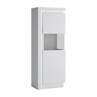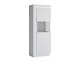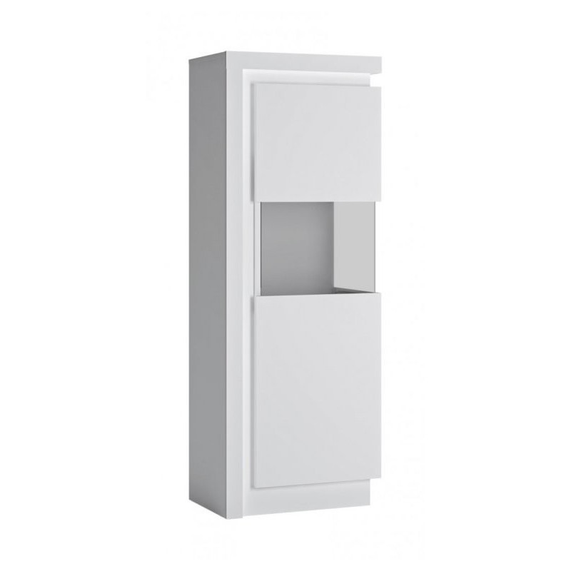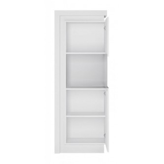 Stylowa witryna prawostronna posiada 164,1 cm wysokości, 59,8 cm szerokości oraz 42 cm głębokości, system bezuchwytowy oraz cichy domyk, wzmacniające nowoczesny, minimalistyczny efekt mebla. Szkło Antisol jest produktem hartowanym, zapewniającym wysoką odporność na uszkodzenia. Zastosowanie wysokiej klasy materiałów, takich jak płyta wiórowa laminowana sprawia, że witryna asymetryczna LYON biały jest produktem odpornym na uszkodzenia oraz wilgoć. Trwała, pojemna, nowoczesna witryna sprawdzi się w jadalni oraz w salonie.