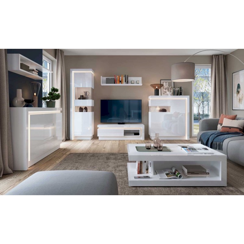Stylowa, nowoczesna, asymetryczna witryna z przeszkleniem oraz oświetleniem LED, oferowanym w zestawie zachwyca niezwykłym efektem. Wyjątkowa witryna prawostronna LYON biały prezentuje urzekające białe fronty, wykończonych na wysoki połysk. Biały kolor kolekcji zdecydowanie wpisuje się w nowoczesną stylistykę wnętrz, doskonale komponując się z neutralną barwą oświetlenia witryny. Mebel posiada efektowny pasek LED, rozmieszczony wzdłuż górnego wieńca oraz jednego z boków, dodatkowo możesz podświetlić wenętrze witryny dokupując oświetlenie typu Square.