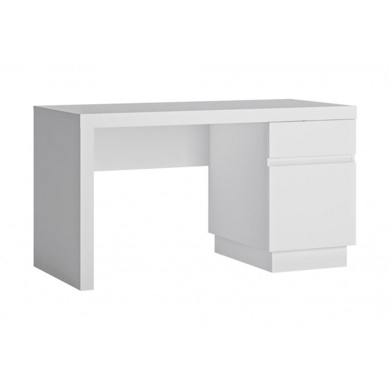 Nowoczesne biurko z kolekcji LYON biały wyposażone zostało w praktyczną szufladę z mechanizmem cichego domyku oraz drzwiczki, za którymi kryje się praktyczna przestrzeń do przechowywania. Dzięki systemowi bezuchwytowemu biurko prezentuje się bardzo nowocześnie. Stylowe, praktyczne biurko z serii LYON biały wykonano z płyty wiórowej laminowanej, charakteryzującej się odpornością na wysoką temperaturę, promienie UV, wilgoć oraz uszkodzenia mechaniczne, powstałe w wyniku zarysowania.