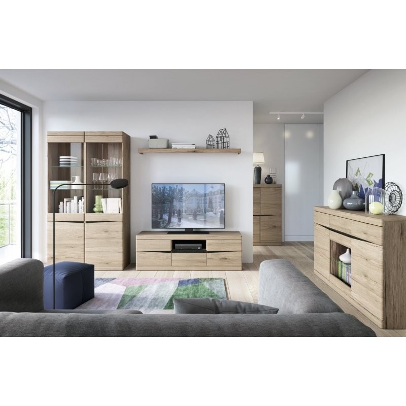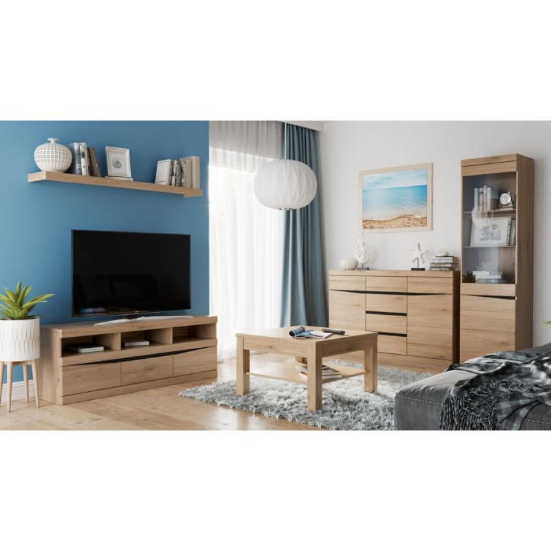 - Pojemna, dwuskrzydłowa witryna została wyposażona w szereg półek, na których możesz przechowywać wszystkie najpotrzebniejsze rzeczy w salonie.