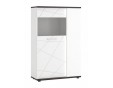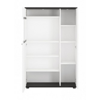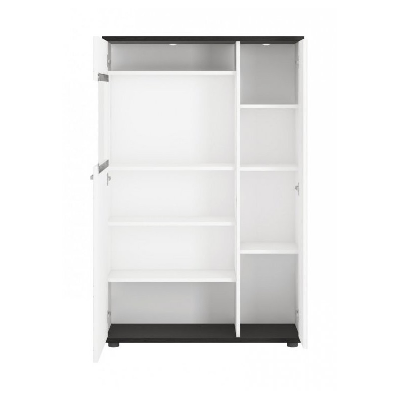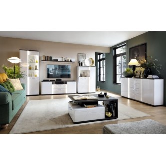 Stylowy mebel z kolekcji Venezia wykonany został z płyty wiórowej laminowanej (korpus) oraz płyty MDF w wysokim połysku (fronty). Biała witryna Venezia posiada czarne wstawki w odcieniu dąb Vicenza.