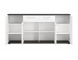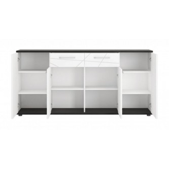 Kolorystyka komody dużej z kolekcji Venezia zachwyca nowoczesnością. Zestawienie bieli z czernią (dąb Vicenza czarny) oraz metalowe uchwyty sprawiają, że produkt pasuje do pomieszczenia nowoczesnego i minimalistycznego. Blat komody dodaje jej efektowności i zwiększa funkcjonalność użytkowania.