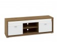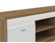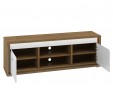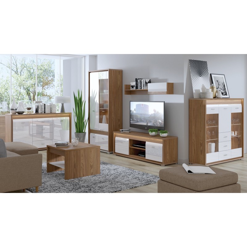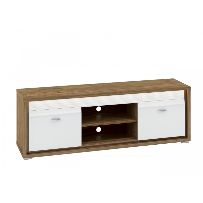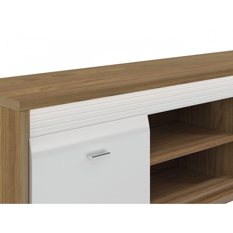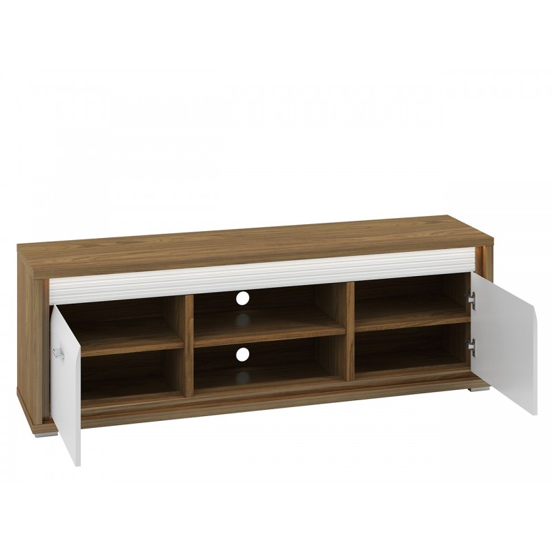 Szafka RTV Dallas 11 idealnie sprawdzi się do zaaranżowania strefy wypoczynkowo-telewizyjnej. Połączenie dekorów biały połysk z naturalnym orzechem oraz ryflowana, podświetlana listwa MDF w tych dwóch wybarwieniach do wyboru z pewnością dodadzą wnętrzu elegancji i świeżości. Długi i głęboki blat pomieści potrzebny sprzęt czy gustowne dekoracje, a otwarta półka posłuży do estetycznego przechowywania drobnego sprzętu. Ponadto, po zewnętrznych stronach mebla zastosowano pakowne szafki. Wykonanie z najwyższej jakości płyty laminowanej, zabezpieczonej obrzeżem ABS, wpływa na trwałość i estetykę bryły. Zastosowanie systemu cichy domyk zapewnia przyjemne użytkowanie. Lekko zaokrąglone fronty z płyty MDF zostały ozdobione subtelnymi chromowanymi uchwytami, które pięknie uzupełniają całość.