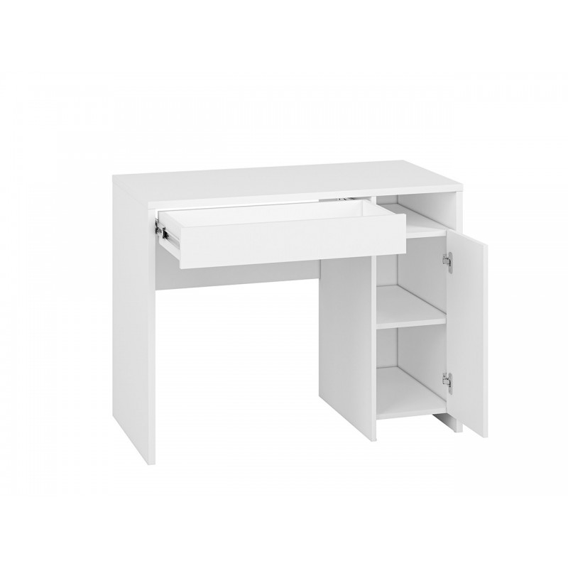 Biurko Kendo 01 to funkcjonalny i ergonomiczny mebel, który pomoże w urządzeniu kącika do nauki czy pracy w domowym zaciszu, a także świetnie sprawdzi się w roli nowoczesnej toaletki. Prosta bryła oraz biel korpusu i frontów nadają bryle uniwersalności i lekkości. Ukryta pod blatem otwarta półka, w pełni wysuwająca się szuflada oraz szafka po prawej stronie to idealne schowki na przybory czy inne podręczne przedmioty. Mebel został wykonany z wysokiej jakości płyty laminowanej, która dodatkowo została zabezpieczona trwałym i odpornym na uderzenia obrzeżem ABS. Biurko w towarzystwie komody Kendo 04 to praktyczny zestaw np. w pokoju młodzieżowym.