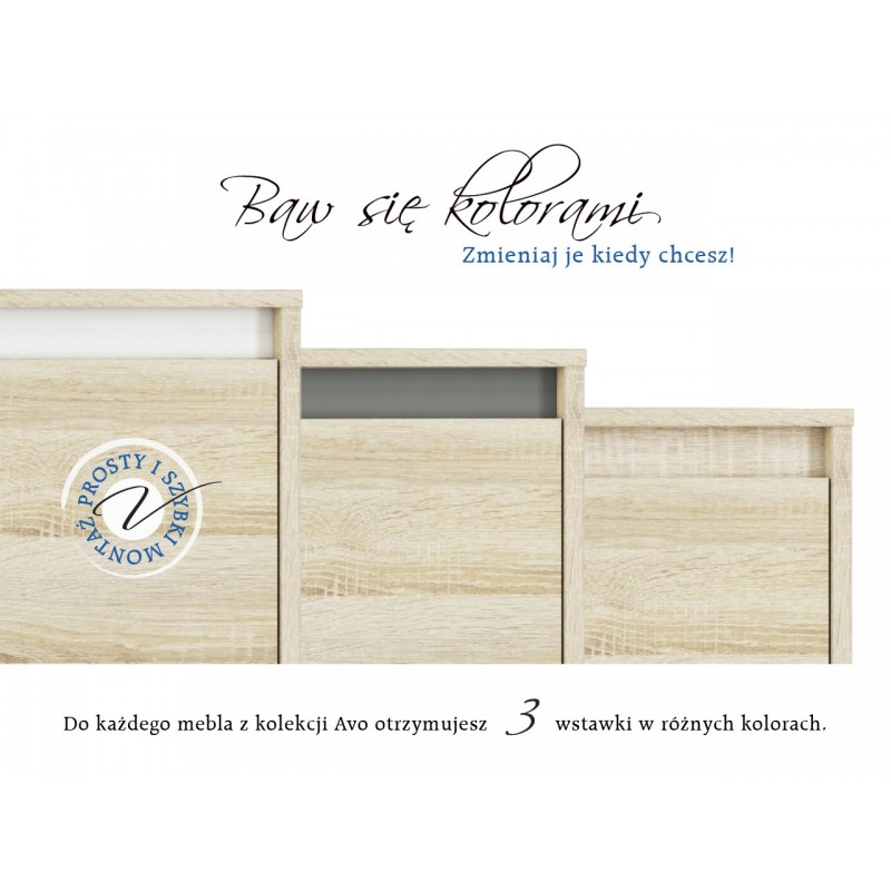 Minimalizm i uniwersalność to główne cechy kolekcji Avo. Proste bryły w ponadczasowym dekorze o widocznym usłojeniu wzbogacono o nowoczesne wstawki w trzech kolorach (biały, antracyt i sonoma jasna), dzięki czemu w dowolnym momencie możemy zmienić wygląd naszego zestawu.