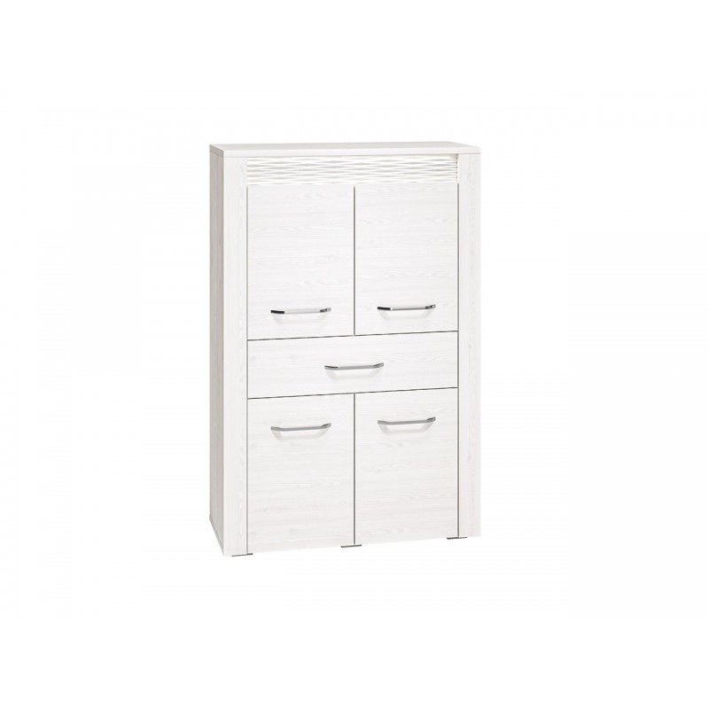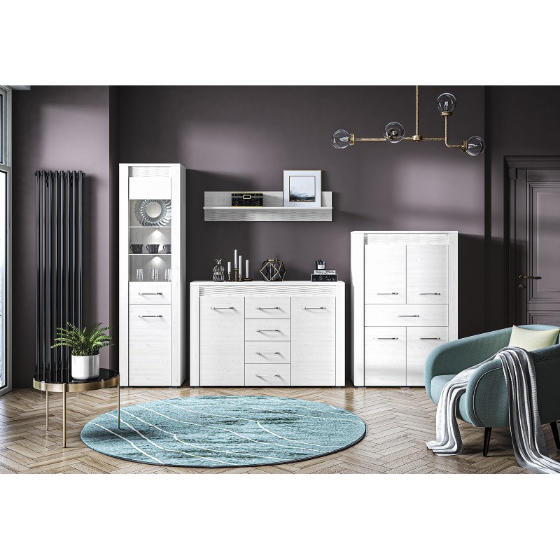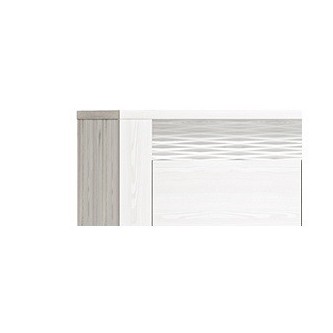 Szeroka gama brył z kolekcji CLERMONT pozwoli na zaaranżowanie nowoczesnego salonu czy jadalni. Wzór bielonego drewna z widocznym usłojeniem został wzbogacony ryflowaną, podświetlaną wstawką, co jeszcze bardziej podkreśla wyjątkowy dekor sosny śnieżnej. Chromowany uchwyt dodaje elegancji i szyku.
