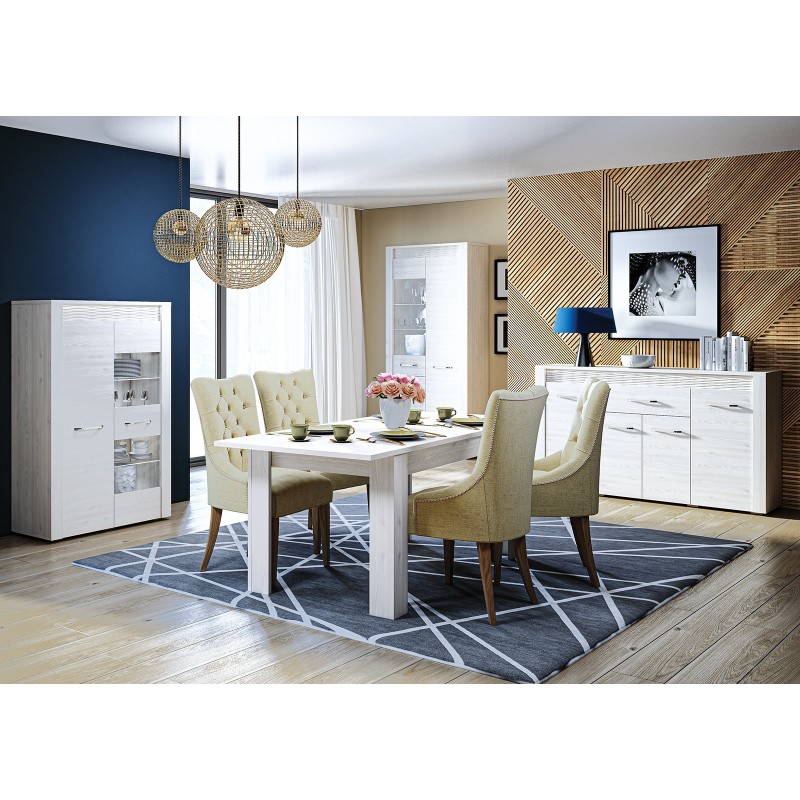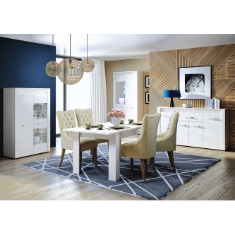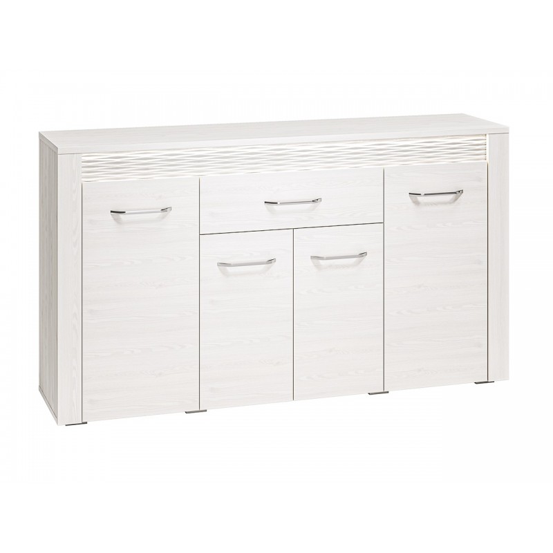 Szeroka gama brył z kolekcji CLERMONT pozwoli na zaaranżowanie nowoczesnego salonu czy jadalni. Wzór bielonego drewna z widocznym usłojeniem został wzbogacony ryflowaną, podświetlaną wstawką, co jeszcze bardziej podkreśla wyjątkowy dekor sosny śnieżnej. Chromowany uchwyt dodaje elegancji i szyku.