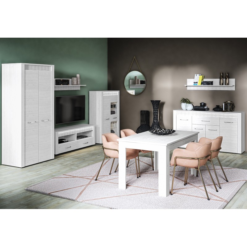 Szeroka gama brył z kolekcji CLERMONT pozwoli na zaaranżowanie nowoczesnego salonu czy jadalni. Wzór bielonego drewna z widocznym usłojeniem został wzbogacony ryflowaną, podświetlaną wstawką, co jeszcze bardziej podkreśla wyjątkowy dekor sosny śnieżnej. Chromowany uchwyt dodaje elegancji i szyku.