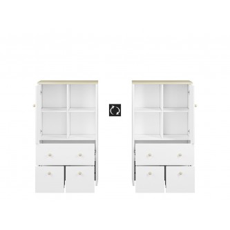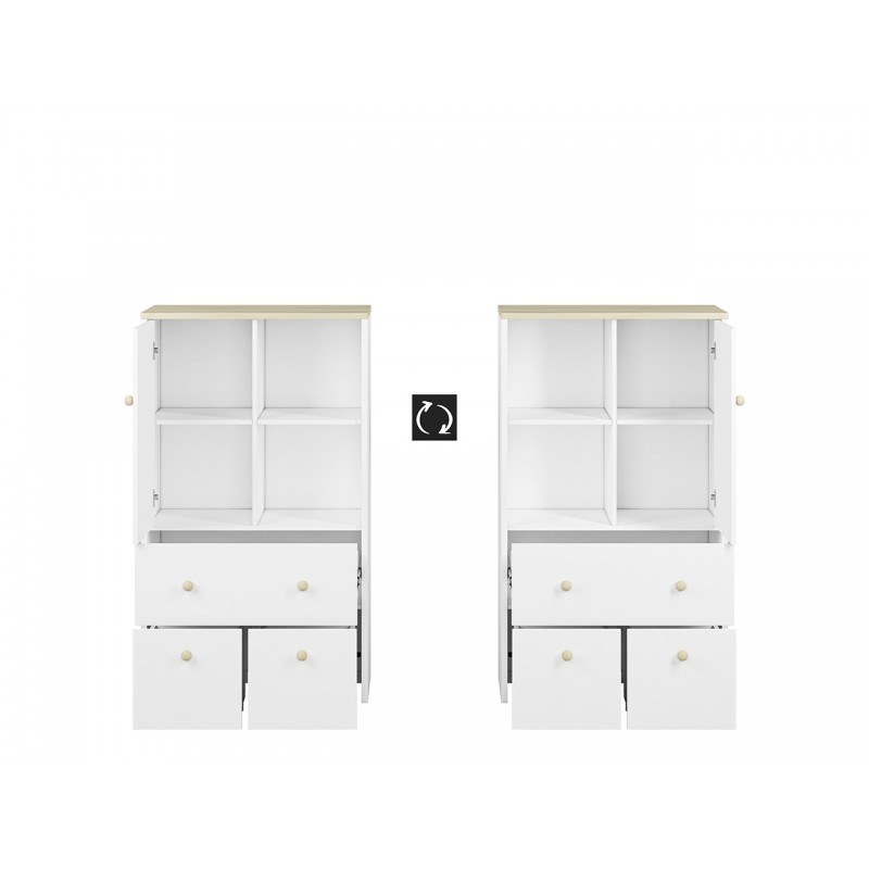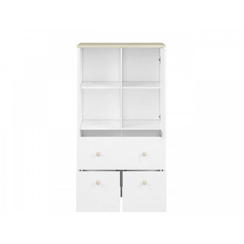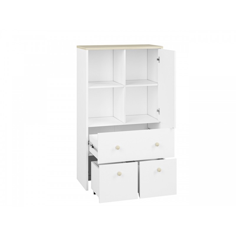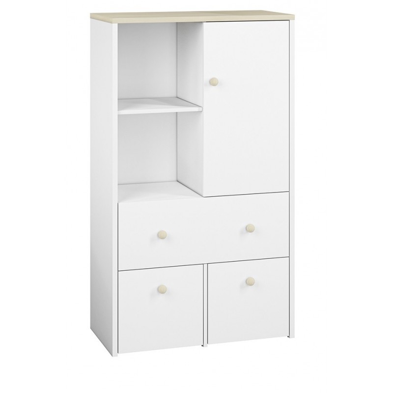 Komoda Elmo to niezwykle praktyczny produkt, oferowany przez ML Meble. Składa się on z dwóch otwartych wnęk, dwóch kontenerków, szuflady, oraz półki znajdującej się za zamkniętymi drzwiami, co daje możliwość przechowania dużej liczby elementów. Nowoczesność komody Elmo podkreśla wzmocnione dno szuflad oraz ich pełen wysuw, który ułatwia przechowywanie artykułów. Opcja wymiany frontów (dostępna za dopłatą), daje możliwość dopasowania kolorystki do pokoju chłopca i dziewczynki. Wybierz meble Elmo, ciesz się z funkcjonalnej i prostej aranżacji!