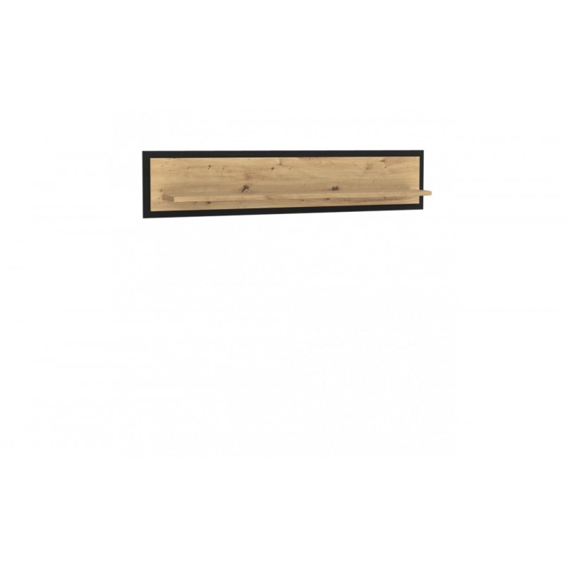 Nowoczesna i elegancka półka wisząca z tej kolekcji jest propozycją na zagospodarowanie wolnego miejsca na ścianie salonu lub jadalni. Idealnie zaprezentuje się zarówno nad komodą, szafką RTV, jak i nad sofą w zestawieniu z drugą półką. Wykonana w wybarwieniu Dąb Artisan i oprawiona w wyrazistą ramę w dekorze Dąb Czarny staje się ozdobą każdej aranżacji