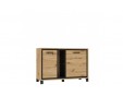 Cechą charakterystyczną komody i niewątpliwą dekoracją jest listwa w dekorze Dąb Czarny zamontowana wewnątrz korpusu, tworząca efektowną, wyrazistą linię wokół frontów bryły. Na wnętrze mebla składają się dwie zamykane szafki z półkami oraz otwarte wnęki ze szklaną półką, w których idealnie zaprezentują się modne dekoracje. Komfort użytkowania zapewni mechanizm z hamulcem zamontowany w drzwiczkach mebla, zapewniający lekkie i łagodne zamykanie