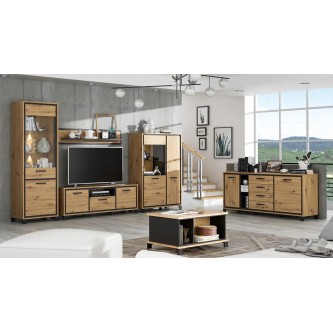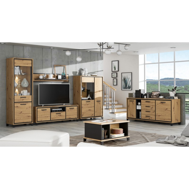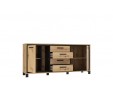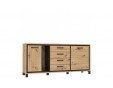 Cechą charakterystyczną komody i niewątpliwą dekoracją jest listwa w dekorze Dąb Czarny zamontowana wewnątrz korpusu, tworząca efektowną, wyrazistą linię zarysowującą kontur frontów bryły. Na wnętrze mebla składają się dwie zamykane szafki z półkami oraz cztery szuflady, które ułatwią utrzymanie porządku i segregację wszystkich drobiazgów. Komfort użytkowania zapewni mechanizm z hamulcem zamontowany w drzwiczkach mebla, zapewniający lekkie i łagodne zamykanie