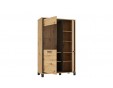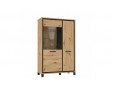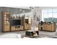 Niska dwudrzwiowa witryna w dekorze dąb Artisan ozdobiona jest listwą w dekorze Dąb Czarny, tworzącą efektowną linię wokół jej drzwiczek.Półki widoczne za przeszkleniem oraz te umiejscowione za zabudowanym frontem pozwalają zarówno na odpowiednią ekspozycję dekoracji, jak i na ukrycie rzeczy osobistych. Wnętrze mebla można jeszcze lepiej uwydatnić montując za szklanymi półkami punktowe oświetlenie (dostępne za dodatkową opłatą)