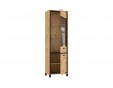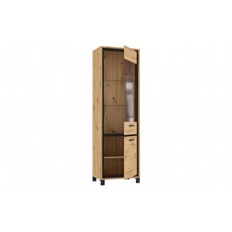 Wysoka, smukła witryna w dekorze dąb Artisan ozdobiona jest listwą w dekorze Dąb Czarny, tworzącą efektowną linię wokół jej drzwiczek. Półki widoczne za przeszkleniem oraz te umiejscowione za zabudowanym frontem pozwalają zarówno na odpowiednią ekspozycję dekoracji, jak i na ukrycie rzeczy osobistych. Wnętrze mebla można jeszcze lepiej uwydatnić montując za szklanymi półkami punktowe oświetlenie (dostępne za dodatkową opłatą)