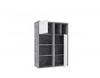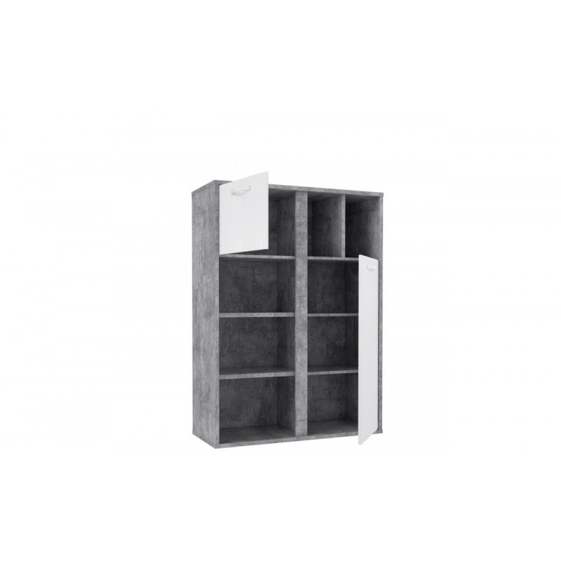 Regał wyróżnia się ciekawym i nowoczesnym designem. Korpus mebla w kolorze Beton Jasnoszary przełamują dwa białe fronty. Regał ma pięć otwartych półek oraz cztery półki skryte za białymi frontami. Pomieszanie półek otwartych z zamkniętymi pomoże utrzymać porządek w pokoju młodzieżowym.