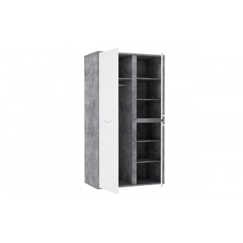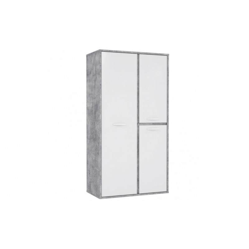 Trzydrzwiowa szafa ubraniowa z tej kolekcji to świetne uzupełnienie aranżacji pokoju młodzieżowego. Pojemny mebel skrywa siedem półek oraz drążek na ubrania. Szafa wykonana jest w dekorach Beton Jasnoszary oraz Biały Połysk. Całość dopełniają zaokrąglone uchwyty w kolorze białym.