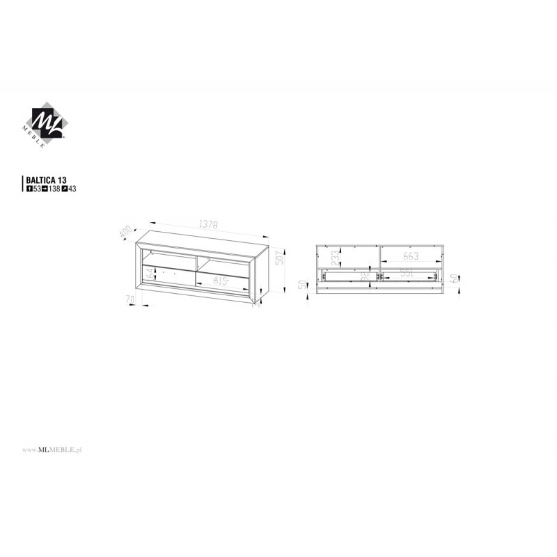 Szafka RTV Baltica 13 to elegancki i funkcjonalny mebel, który idealnie sprawdzi się do zaaranżowania strefy wypoczynkowo- telewizyjnej. Mebel został wyposażony w dwie szuflady o wzmocnionym dnie, które z łatwością pomieszczą i udźwigną ciężar naszych bibelotów czy drobnego sprzętu. Co więcej, szuflady umieszczone są na prowadnicach kulkowych umożliwiających całkowite, ciche wysunięcie szuflady, by zobaczyć jej zawartość. Długi i dość głęboki blat pomieści potrzebny sprzęt czy gustowne dekoracje, a półki nad szufladami posłużą do estetycznego przechowywania np. dekoderów czy konsoli. Mebel został wykonany z wysokiej jakości płyty laminowanej, zabezpieczonej obrzeżem ABS, co wpływa na trwałość i estetykę bryły.