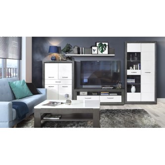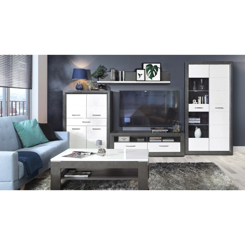 Stolik okolicznościowy z kolekcji LENNOX NEW wspaniale wkomponuje się w aranżację nowoczesnego salonu. Blat wykonany jest w połyskującej bieli, natomiast nogi stołu oraz dolna półka wybarwione są w kolorze ciemnoszarego betonu. Całość prezentuje się stylowo i elegancko.