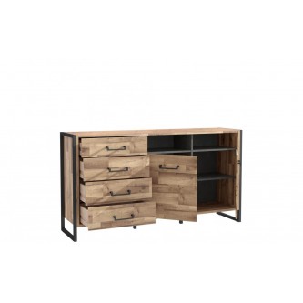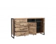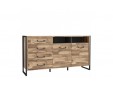 Komoda w industrialnym stylu świetnie sprawdzi się w salonie oraz jadalni. Nowoczesny mebel został wykonany w połączeniu dwóch dopasowanych do współczesnych trendów dekorów: Beton Ciemnoszary oraz Dąb Klepkowy. Designerskiego charakteru dodają czarne uchwyty wykonane z metalu.