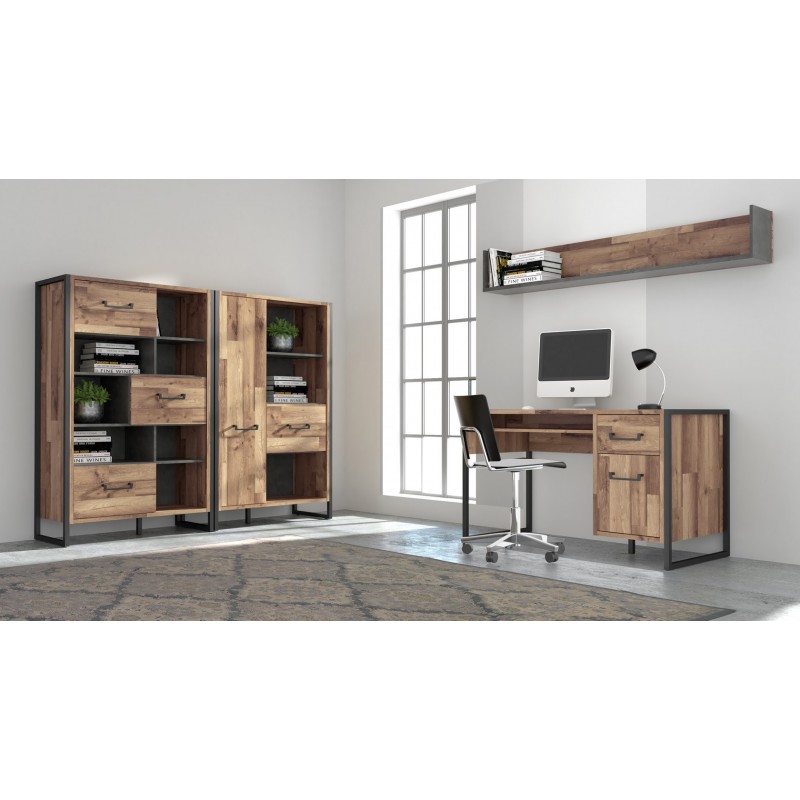 Elegancki regał w nowoczesnym stylu doskonale wpisze się we wnętrze salonu, domowego gabinetu czy też pokoju młodzieżowego. Wykonany w dekorze Dąb Klepkowy ze wstawkami w dekorze Beton Ciemnoszary wyróżnia się oryginalnym designem.