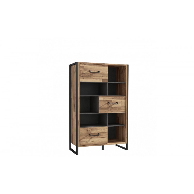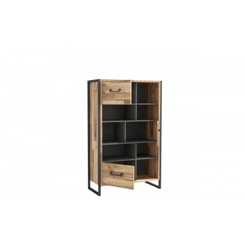 Nowoczesny regał to fantastyczny mebel do biura, salonu lub pokoju młodzieżowego. Mebel został wykonany w dekorze Dąb Klepkowy, który doskonale odwzorowuje naturalne drewno i nada pomieszczeniu przytulnego i eleganckiego klimatu. Bryłę mebla okalają ramowe nogi i wstawki w kolorze Betonu Ciemnoszarego.