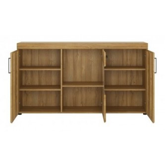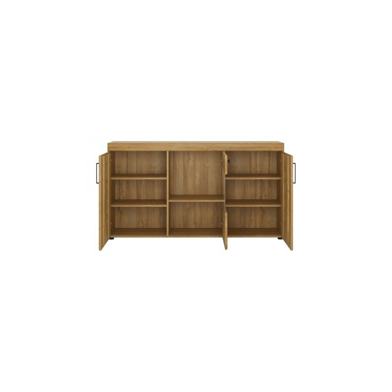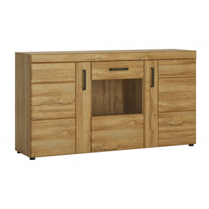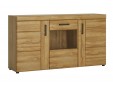 Komoda 3-drzwiowa będzie stanowiła kompromisowe rozwiązanie zarówno w stosunku rozmiarów jak i wykorzystania zalet komody i witryny. W w pięknym wybarwieniu dębu grandson będzie bardzo solidnie i elegancko wyglądała w każdym salonie, czy jadalni. Parę otwieranych nieprzeźroczystych drzwiczek po obu stronach rozdzielają drzwi przeszkole, które mogę poniekąd spełniać rolę witryny na zestaw kieliszków czy filiżanek. Ponadto komoda wyposażona jest w szufladę na resztę bibelotów do schowania.