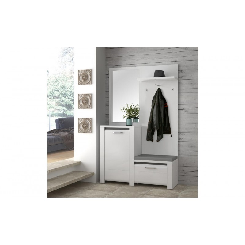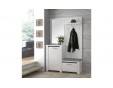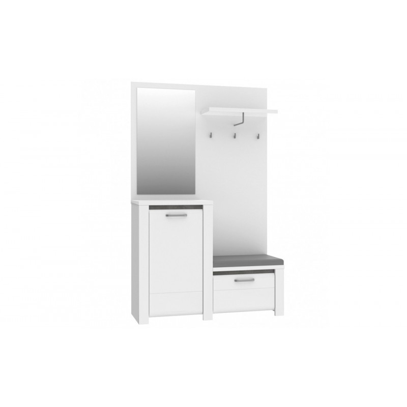 Zestaw meblowy do przedpokoju będzie idealnym miejscem do przechowywania ubrań, butów i innych niezbędnych akcesoriów. Zintegrowany mebel wyposażony jest w panel ubraniowy, wygodne tapicerowane siedzisko, szafkę na buty oraz duże, przejrzyste lustro. Subtelny dekor Biały Połysk zestawiony z kontrastującymi z nim elementami w dekorze Beton Ciemnoszary doda pomieszczeniu uroku i elegancji.