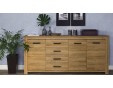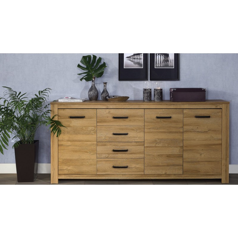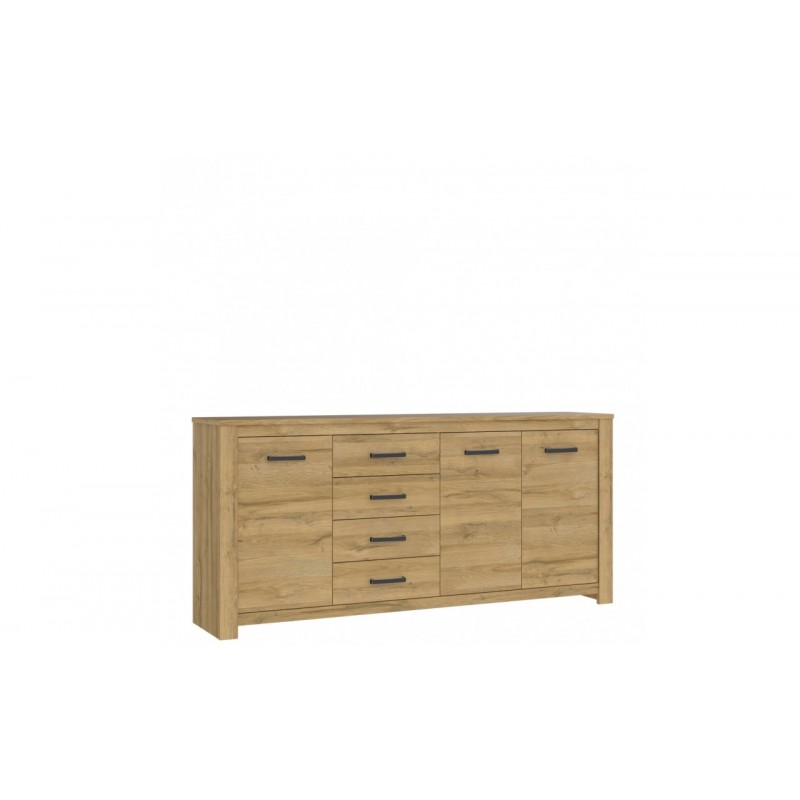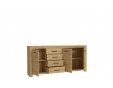 Nowoczesna komoda jest elementem całości pokoju dziennego, salonu oraz jadalni. Posiada cztery szuflady oraz trzy zamknięte szafki, dzięki czemu zapewni dużo miejsca do przechowywania różnego rodzaju przedmiotów a bardzo szeroki blat doskonale sprawdzi się jako miejsce do wyeksponowania ulubionych dekoracji czy rodzinnych zdjęć, pamiątek.