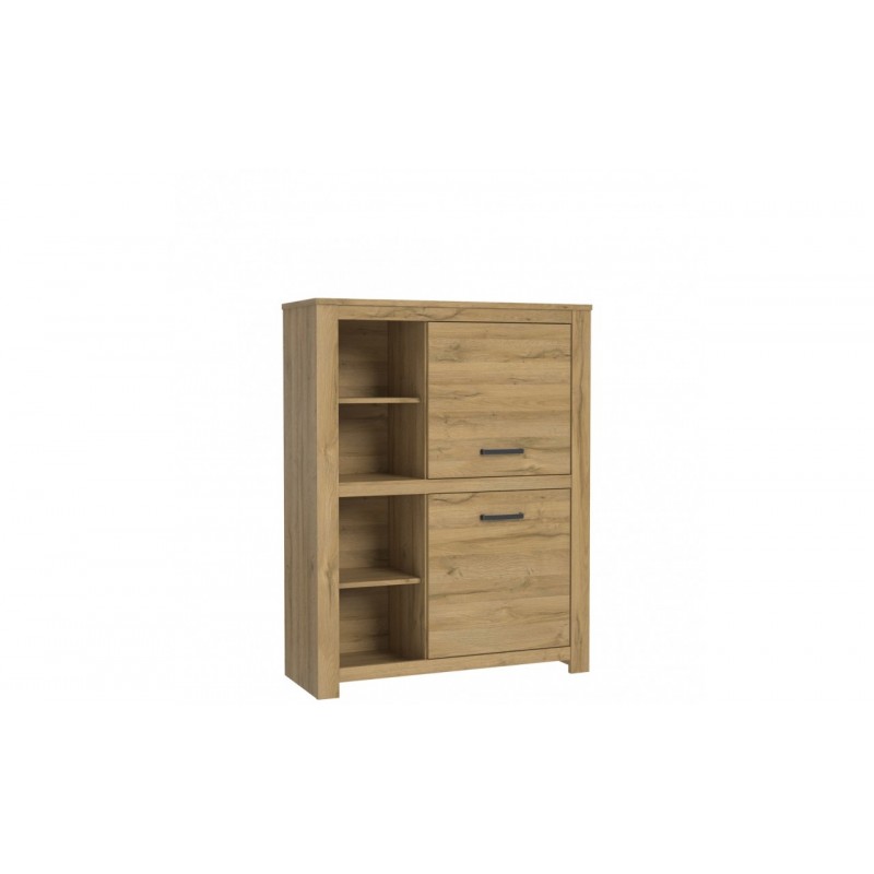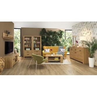 Asymetryczny regał w dekorze Dębu Postarzanego świetnie komponuje się z klasycznymi, czarnymi uchwytami. Na wnętrze regału składają się dwie zamykane szafki oraz otwarte półki na których można ułożyć serię książek, czy też rodzinne zdjęcia. Regał doskonale prezentuje się jako samodzielny mebel, jak również w zestawieniu z innymi meblami z tej samej kolekcji.