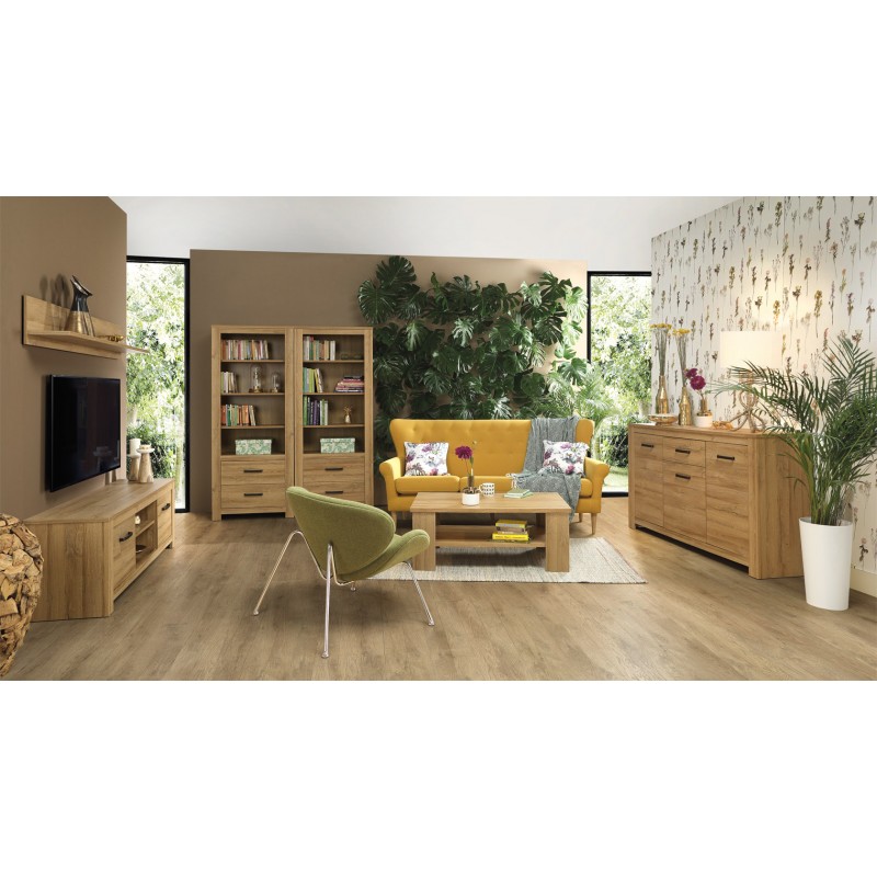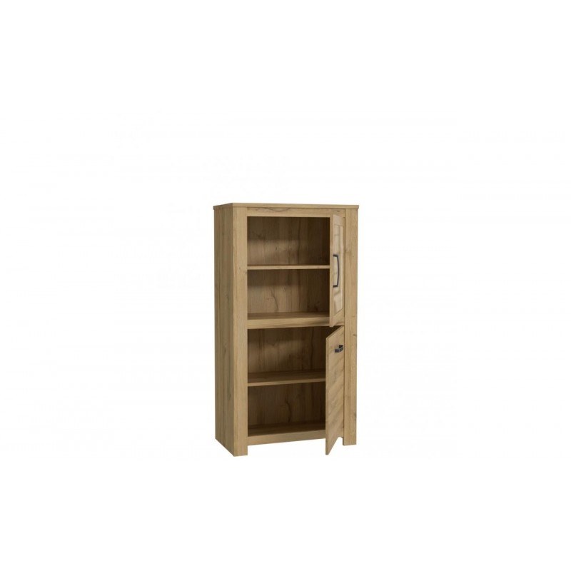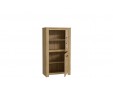 Niska witryna wykonana z płyty meblowej w dekorze Dąb Postarzany dzięki funkcjonalności i niewielkim rozmiarom z łatwością dopasowuje się do większości pomieszczeń oraz aranżacji. Za przeszklonym frontem witryny znajdują się półki, na których można ustawić przedmioty, które chce się wyeksponować. Dolna część mebla, ukryta za pełnym frontem to miejsce do przechowywania obrusów czy też zastawy stołowej.