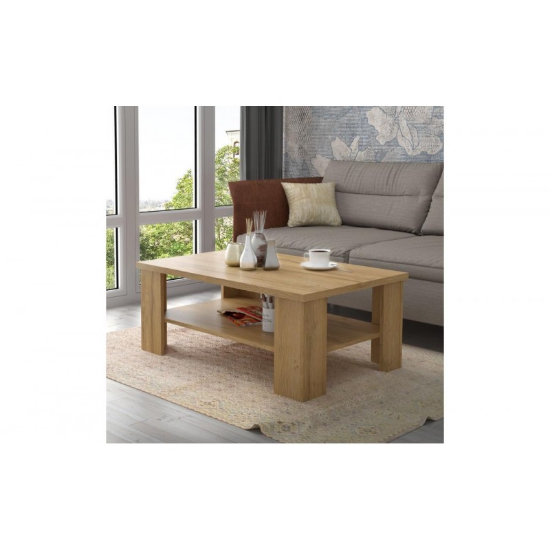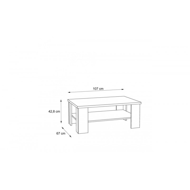 Cechą charakterystyczną stolika jest dekor doskonale imitujący strukturę i wybarwienie naturalnego drewna oraz szerokie narożne nóżki, które nadają mu solidności i stabilności. Ważnym elementem jest praktyczna półka do przechowywania niezbędnych przedmiotów, które stale muszą być "pod ręką".